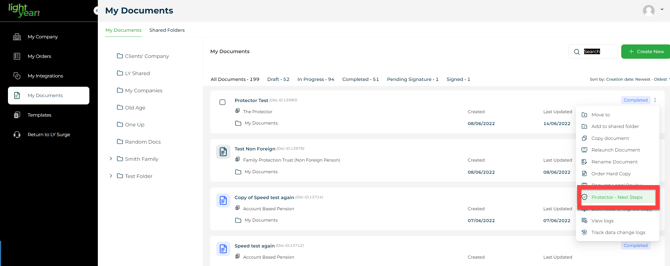 LightYear Group now provide aid in the completion of Protector Document Packs. This includes assistance in the completion of trust deed stamping and registration of mortgages (if applicable). Once a user has completed a Protector document, the “Next Steps” are available in the completion pop-up that appears after assembly. Completion of a Protector may include a mortgage or PPSR registration, which will take a user to the Mortgage & PPSR forms..